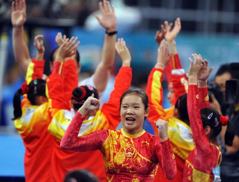 2008年8月13日,中国队队员程菲(前)握拳庆祝夺冠。当日,在北京奥运会体操女子团体决赛中,中国队夺得冠军。新华社记者 王雷 摄