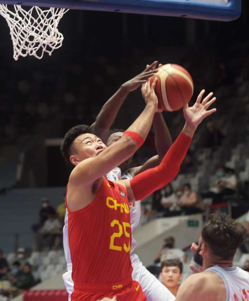 2022年7月14日,贺希宁(前)在2022男篮亚洲杯小组赛中拼抢。新华社发(祖卡南摄)