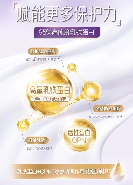 1、超凡保护力:95%高纯度乳铁蛋白含量高达100mg/100g,能有效防护11类有害病菌入侵,减少68%的宝宝肚肚不适和52%的呼吸系统不适,搭配OPN双效协同,能进一步增强宝宝自身防护力。再加上乳源HMO,可激发免疫球蛋白slgA分泌提升,为宝宝构建更坚固的防护屏障,减少生病几率。