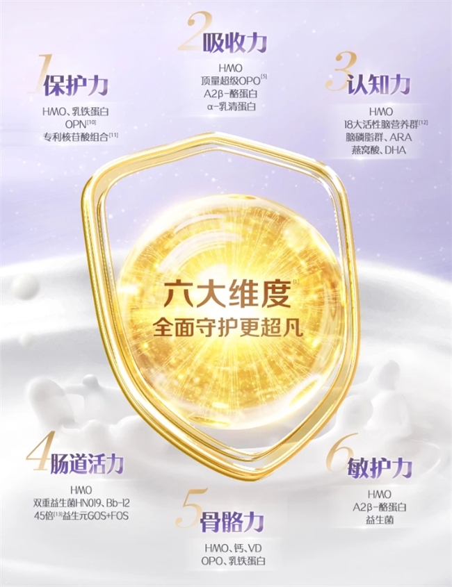 基于这70多年的深入探究,金领冠构建了“六位一体”科研战略,全面聚焦婴幼儿吸收、保护、脑营养、肠道、骨骼及低致敏六大核心需求,并将研究成果转化为科学配方,为宝宝提供更科学、全面的营养支持。同时打造了“五重新鲜领航体系”,从奶源、原料、奶粉、工艺、包装五大维度,领航婴幼儿奶粉鲜活标准,全面锁住“鲜活”营养,为婴幼儿健康保驾护航。