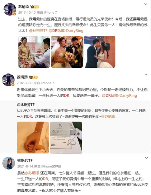 对此最有发言权的,便是前文提到的,四度为妻子献上DR的“亚洲飞人”苏炳添。2016年,当他决心和初恋林艳芳共度一生时,便以DR求婚钻戒向妻子诉说真心。次年大婚时,他们又以结婚对戒,将这份坚定爱意昭告所有亲友。2018年,妻子诞下儿子小天天时,他更是迫不及待为辛苦的她送上DR真爱礼物,告白道“谢谢你勇敢生下小天天,一生只送一人的DR,我要送你一辈子”。2021年七夕时,他又再度送上节日礼物。从校园到婚纱,相恋16年,又结婚牵手近十年,苏炳添对妻子那份“守护一生”承诺,凝结于妻子收到的每一份DR中,无声且坚定。