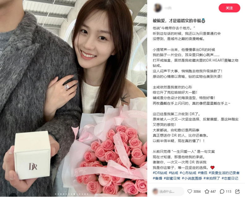 对苏炳添以及无数重返DR的赠送者而言,不断送出的DR代表了承诺的持续兑现、浓烈爱意的再度诉说。而对于收到DR的人而言,这份持续被说明的偏爱,更是最踏实的幸福:用户@一六就在小红书分享了自己的故事,当她以为只是普通约会时,男友却悄悄准备了惊喜,为她升值换款了DR钻戒,她在笔记中写道:“原来被人一次又一次坚定选择、反复偏爱,是这种踏实又想哭的感觉!”,评论区在为她的幸福以及男生的勇敢而触动,也同时萌生了“希望能遇上DR男士”的期待。