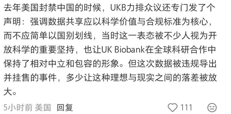调查仍在进行,涉事机构和研究人员的身份尚未公开,数据是否真的被购买也无法完全确认。但困境已经摆在眼前。50 万名志愿者,当初同意贡献自己的健康数据,是出于对科学的信任,对人类未来的善意。他们中的大多数人,即使在得知数据被挂上网后,仍然选择相信这个项目的价值。