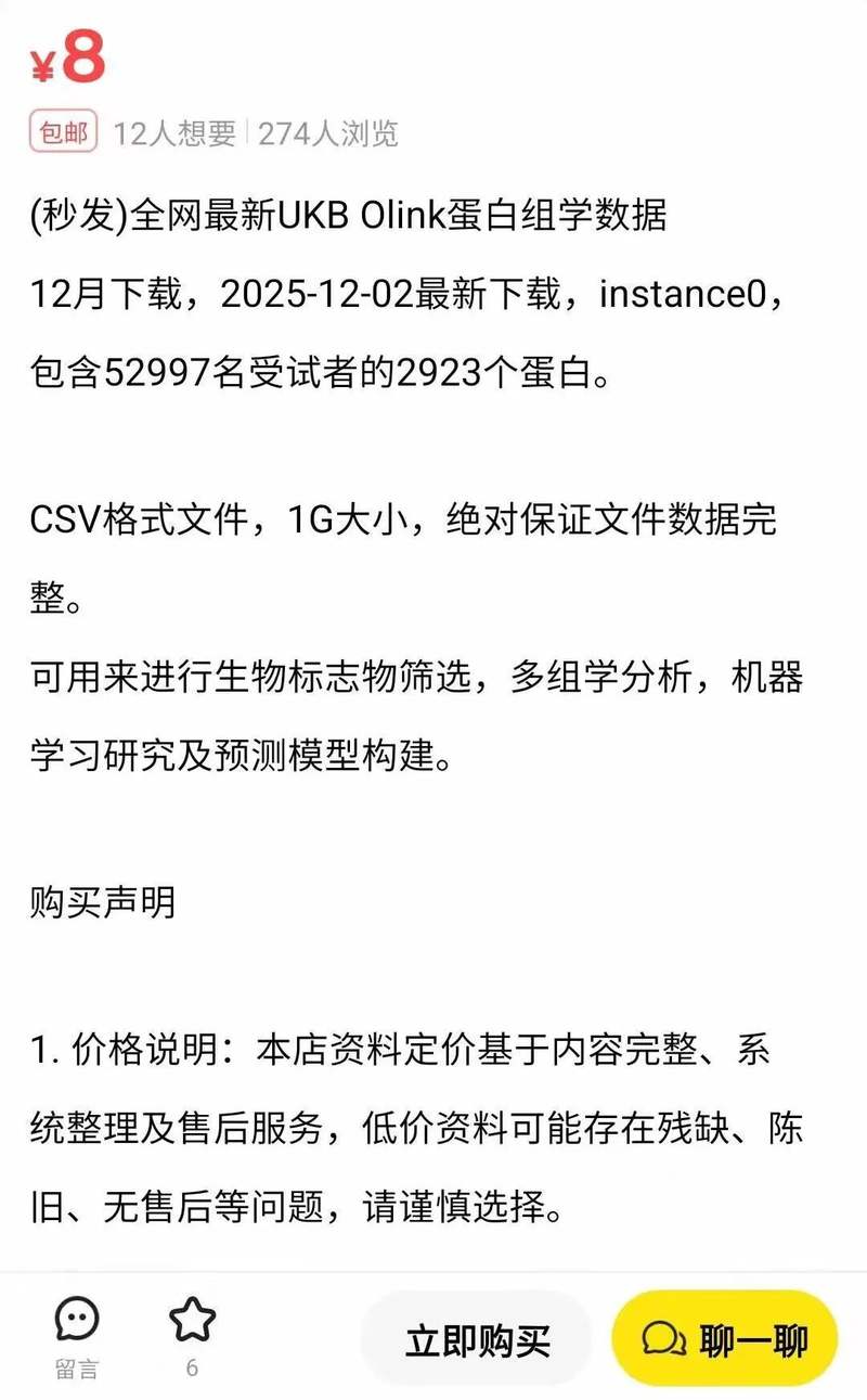 正因如此,数据被挂上网的消息才显得格外刺眼。更讽刺的是,这些数据的来源完全合法。中国三家学术机构通过严格的审核程序,获得了访问 UK Biobank 研究平台的权限。按照规定,这些数据只能用于科学研究,但他们却将其挂到了电商平台上出售。
