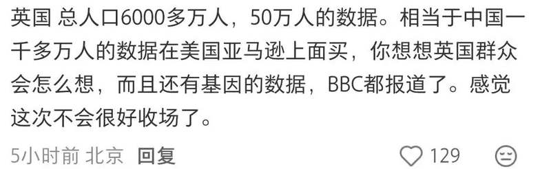 2026 年 4 月,有人在阿里巴巴平台上发现了有数据清单正在出售,内容是英国生物样本库(UK Biobank)50 万名志愿者的医疗数据——性别、年龄、生活习惯、生物样本检测结果,明码标价,等待买家。相关报道中并未指明具体是阿里巴巴旗下哪个平台,但众多网友猜测其应为闲鱼。