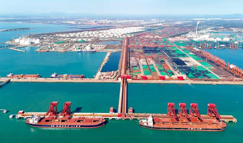 在山东青岛拍摄的山东港口青岛港第二座40万吨矿石码头(无人机照片)。新华社发(张进刚 摄)