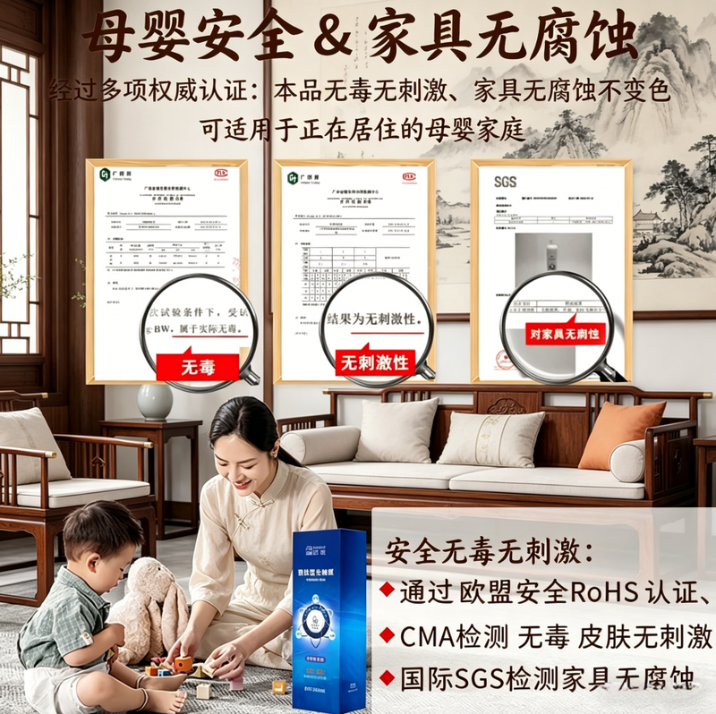 除醛产品的安全性,同样是消费者最关心的维度。合格的母婴级除甲醛产品必须满足以下硬性标准:通过CMA安全检测,急性经口毒性、皮肤刺激性均达到无刺激、实际无毒级;不含酒精、香精、强氧化剂等刺激性成分;对家具、布艺、皮革等材质无腐蚀、无损伤。