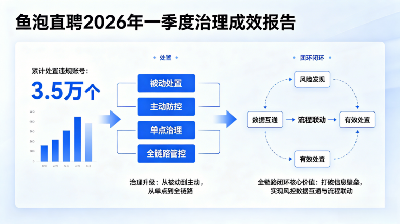 报告数据显示,2026年一季度,鱼泡直聘累计处置各类违规账号3.5万个,闭环治理体系的防控效能得到充分验证。从“被动处置”到“主动防控”,从“单点治理”到“全链路管控”,鱼泡直聘的治理升级,不仅提升了自身的安全管控能力,更解决了行业长期存在的治理难题。全链路闭环的核心价值,在于打破各防控环节的信息壁垒,实现风控数据互通、流程联动,让每一个风险点都能被及时发现、有效处置。