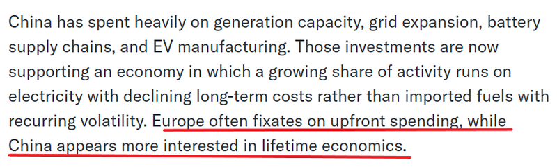 文章认为,中国不会在一夜之间放弃化石燃料,也从未假设能够做到。相反,它一边利用现有燃料,一边快速构建下一代能源架构。文章强调,能源政策的真正成本不在于投资,而在于风险敞口。中国在发电能力、电网扩建、电池供应链和电动汽车制造方面投入巨资。这些投资如今支撑着一个经济体系,在这个体系中,越来越多的经济活动依赖于长期成本不断下降的电力,而非价格波动频繁的进口燃料。相比之下,欧洲往往过于关注前期投入,而中国似乎更注重长远效益。