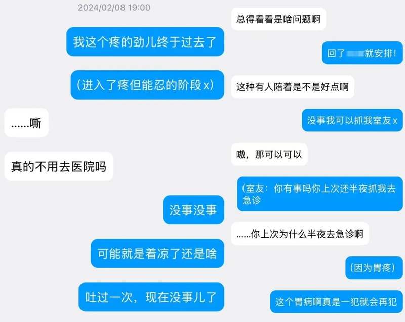 第二次发作是在2024年春节前,我和好久没见面的朋友约了午饭。没想到吃着吃着我又开始“胃疼”,感觉像是着凉了。我只能含泪挥别朋友,回家就趴在电热毯上,希望这样做能舒服一点。