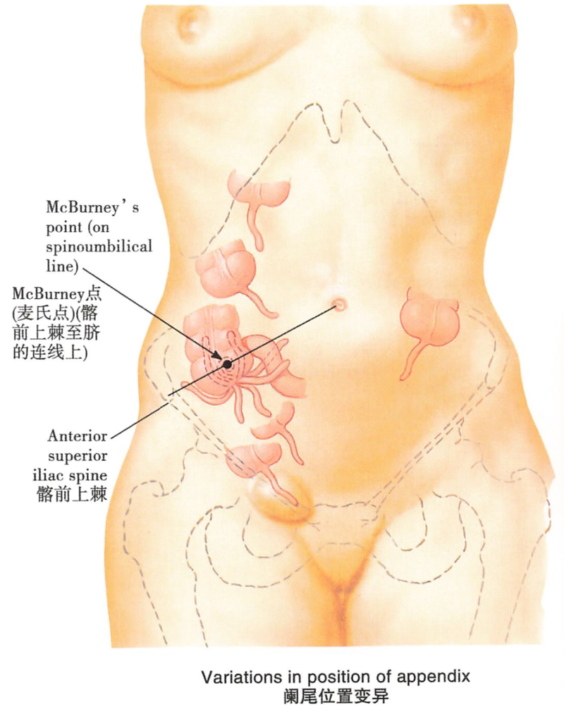 麦氏点(McBurney点)是阑尾在体表的投影,位于右髂前上棘与脐连线的外1/3处。急性阑尾炎常见此处的压痛、反跳痛。反跳痛指按压腹部后,迅速抬手时腹部的疼痛,常见于阑尾炎、腹膜炎等[1]丨《奈特人体解剖学彩色图谱(第7版)》,人民卫生出版社