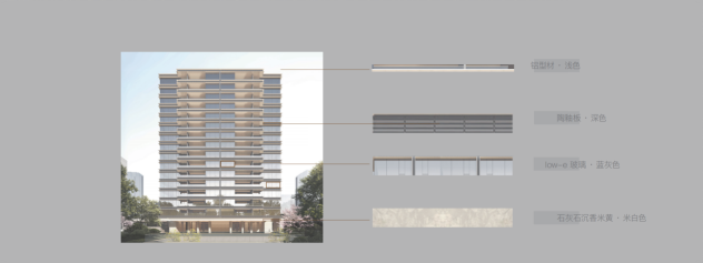 高层建筑外立面融合铝板、均瓷陶砖及石材等多种材料,兼具铝材线条的轻盈挺拔、均瓷陶砖温润多变的光泽感,以及石材的厚重沉稳,形成丰富的视觉层次与独特的艺术张力。