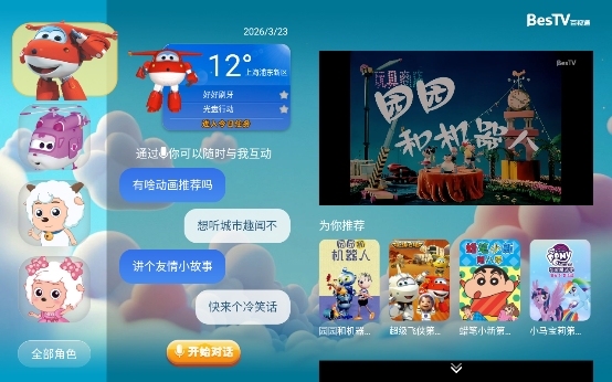 更重要的是,小朋友可自由选择多个IP角色进行互动,以不同性格设定陪伴孩子聊天、阅读与探索,在聊天场景下智能关联推荐视听资源。