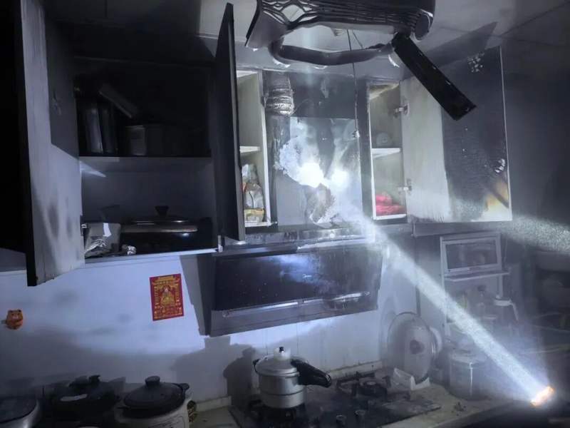 消防员在起火的油锅中泼入冷水,火瞬间变大,事先放置的一双拖鞋也被点燃。