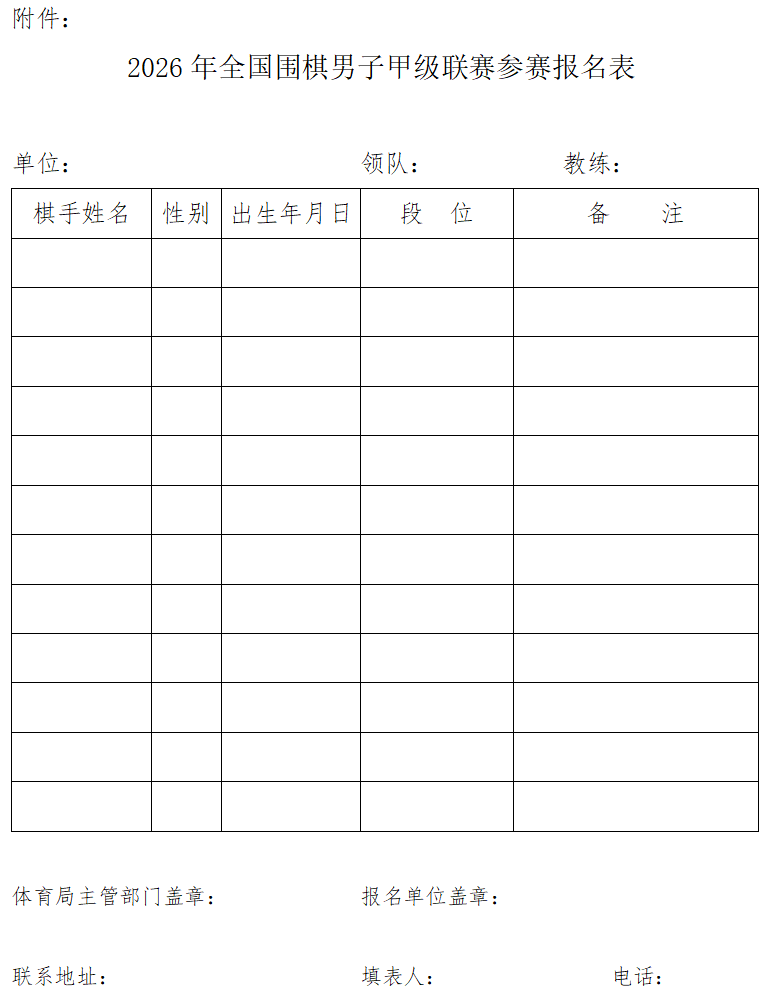 附件:2026年全国围棋男子甲级联赛参赛报名表