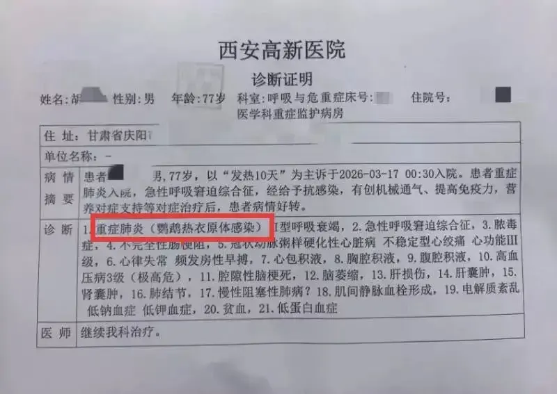 医院诊断证明显示,患者感染了鹦鹉热(psittacosis),也就是由鹦鹉热原体(Chlamydia psittaci,Cps)引发的人畜共患疾病,后被确诊为重症肺炎、I型呼吸衰竭及急性呼吸窘迫综合征。