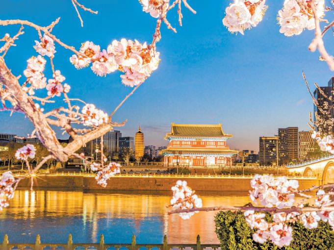 燃灯塔、大光楼与春花相映成趣。白志海摄