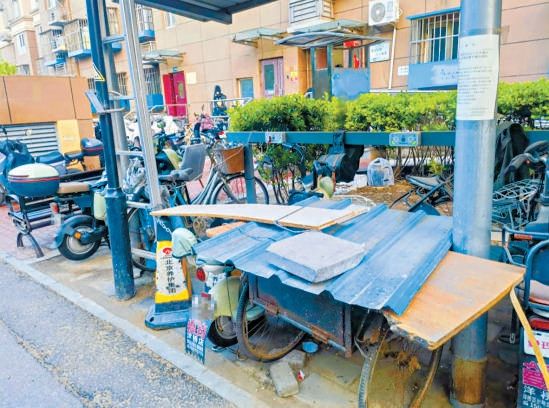 以1号楼北侧的充电车棚为例,车棚里一辆旧三轮车格外显眼。车上拴着大铁链,铁链另一头拴着一架人字梯,一把U型锁又把人字梯锁在了车棚的立柱上,这一套复杂的“九连环”下来,不仅占用空间大,还至少“隔离”了四个充电插口,电动自行车根本无法靠近充电桩。