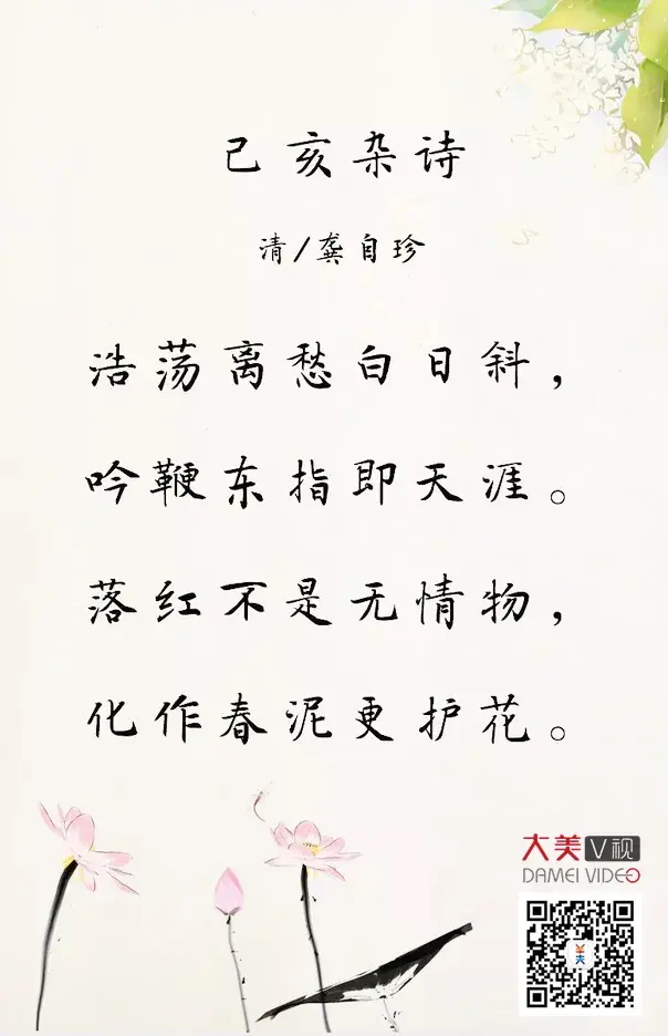 四十八岁的龚自珍辞官离京,万般惆怅失落之下写了此诗。“浩荡离愁白日斜”,离开京城的时候是傍晚时分,夕阳西下。离别的愁绪浩浩荡荡,就像延绵不绝的滚滚江水。