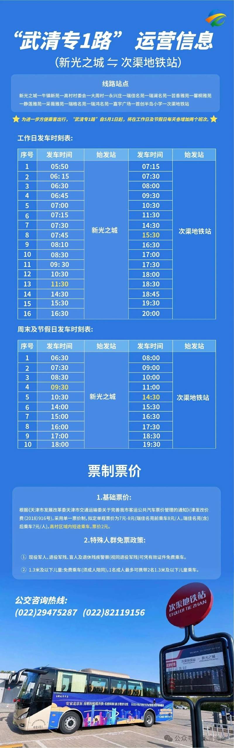 新京报讯 据“北京亦庄”微信公众号消息,日前,武清至北京亦庄定制快巴正式开启试运营。为进一步满足跨省通勤乘客的日常出行需求及“五一”假期期间市民跨区域出行需求,自5月1日起,“武清专1路”公交班次实施优化调整:在工作日及周末节假日,每日增加2个班次。