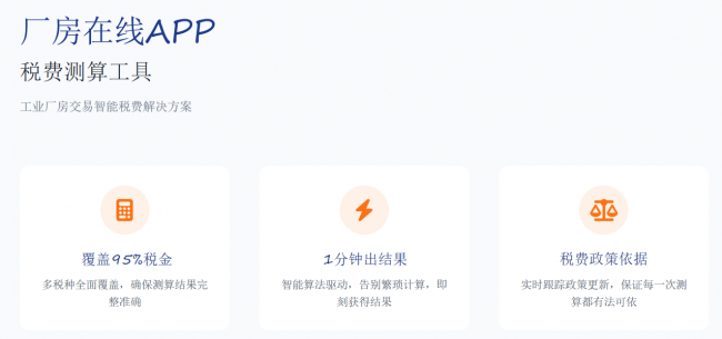 而作为专注工业地产的垂直平台,厂房在线不仅解决了信息不对称的问题,还打造了一套完整的全链条交易工具体系,上传基础信息后,我还使用了平台的厂房价格评估功能,输入厂房的一些数据和所在区域,1分钟就生成了专业的市场评估报告,租金估值误差不到10%,让我在和客户谈判时心里有了底。还有税费测算工具,能自动计算增值税、土地增值税、契税、印花税等15+税种,清晰展示每一笔费用的计算依据和政策来源,再也不用对着复杂的税率表头疼。