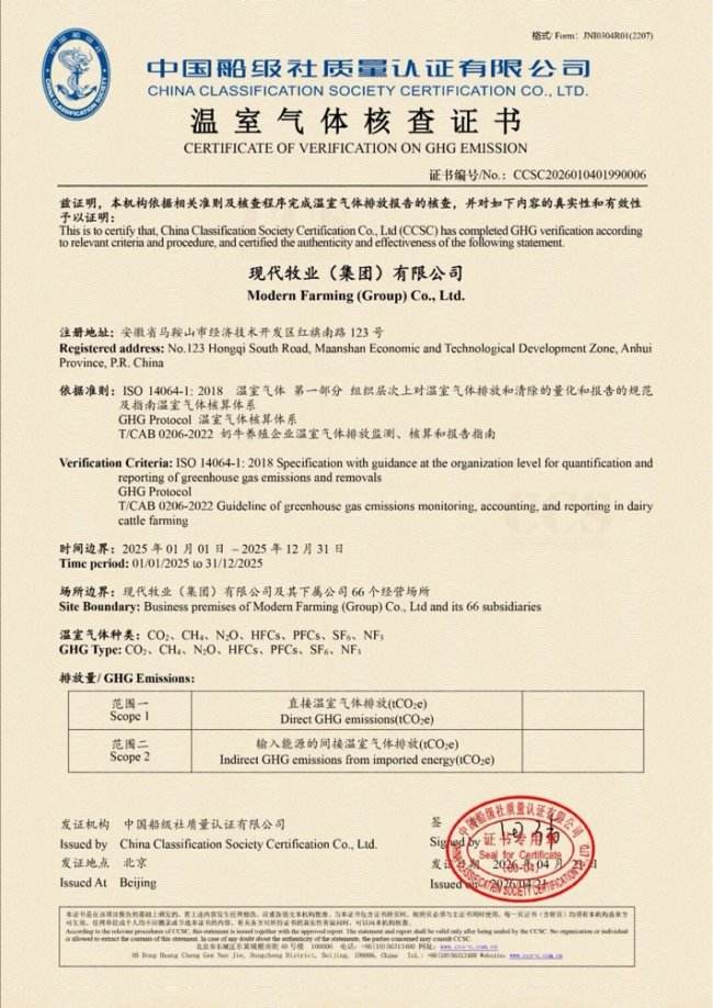 2025年,全球温室气体核查标准迎来全面升级,碳排放边界的划定、数据颗粒度的要求显著提升。面对更为严苛的准入门槛,现代牧业成功一次性通过了ISO14064-1及GHGProtocol温室气体核算体系认证。目前,现代牧业已连续五年获得范围一、范围二认证,连续三年获得范围三全类别认证,标志着低碳管理已从“应对考核的加分项”转变为可持续发展的“硬核基本功”。