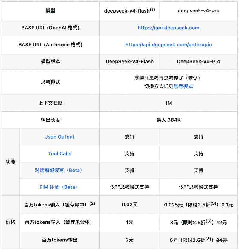 4月26日,DeepSeek官方发布API价格调整公告,全系API输入缓存命中价格降至首发价的十分之一,V4‑Pro更叠加限时2.5折,百万Tokens输入缓存命中低至0.025元,创全球大模型价格新低。