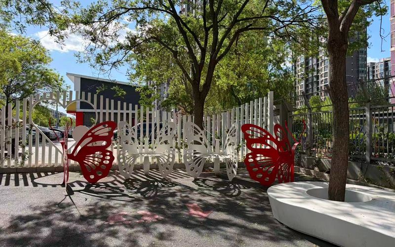 经过半年多的施工改造,这片闲置地块迎来蝶变。公园以“裕见·爱”为主题,寓意裕龙片区居民都能遇见邻里关爱。公园设计分为三个层次:休闲区设置了30米长的休闲座椅;孩童娱乐区设置了大富翁游戏;景观小品区域则布置了蝴蝶座椅和主题装饰,提升公园美观度。
