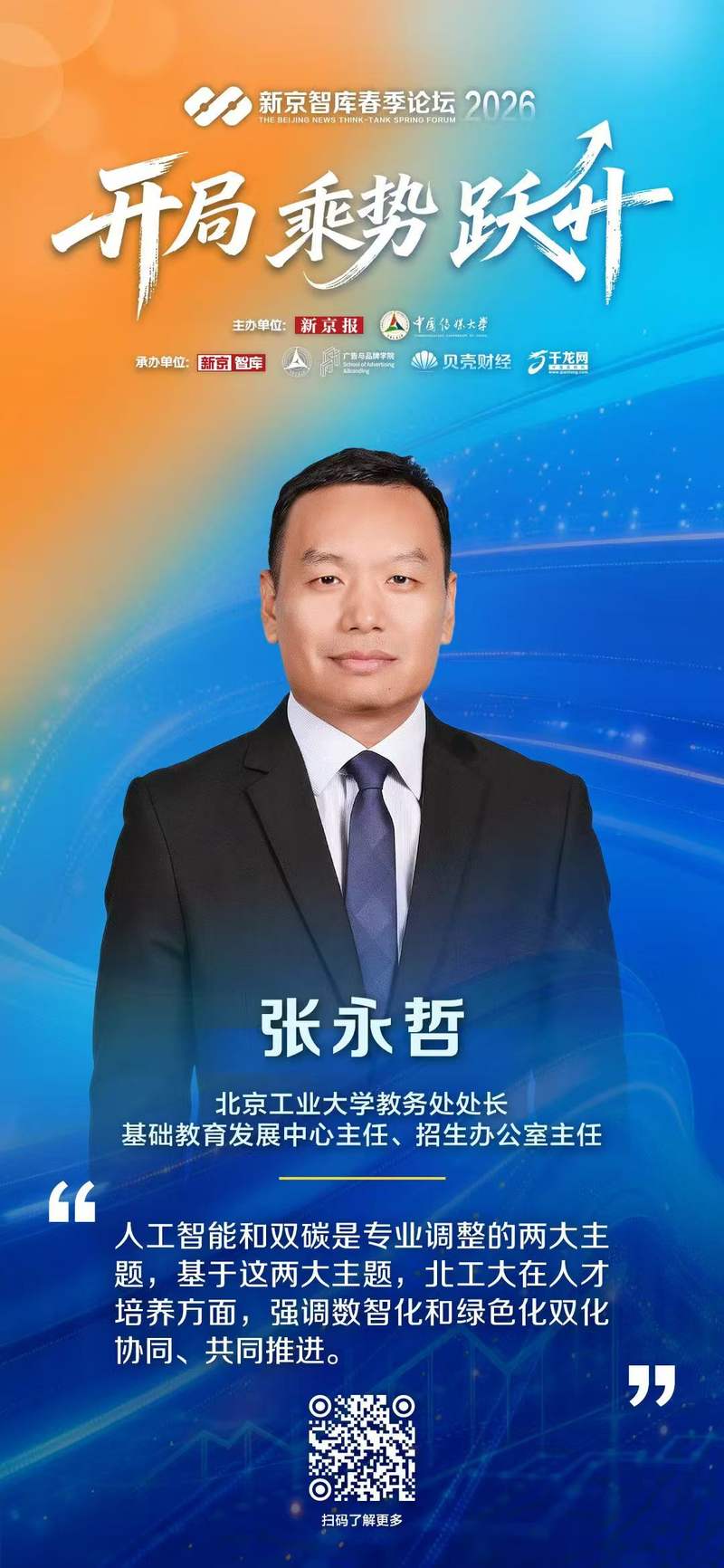 新京报讯(记者徐彦琳)在双碳战略引领产业转型、人工智能重塑产业内涵的时代背景下,高校如何调整人才培养方向、优化专业布局,成为高等教育改革的核心命题。4月25日下午,在新京报社与中国传媒大学联合主办的新京智库春季论坛“智变与新生:AI时代高校专业变革”论坛上,北京工业大学教务处处长、基础教育发展中心主任、招生办公室主任张永哲以《数智化绿色化双化协同,工程人才培养的北工大实践》为题,分享了北工大面向AI时代推进专业改革、构建复合型工程人才培养体系的探索与实践。