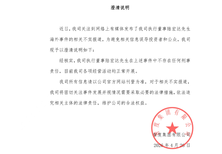 新京报贝壳财经讯 智度集团4月26日发布澄清说明称,近日,公司关注到网络上有媒体发布了公司执行董事陆宏达海外事件的相关不实报道,为避免相关信息误导投资者和公众,公司现予以澄清说明如下: