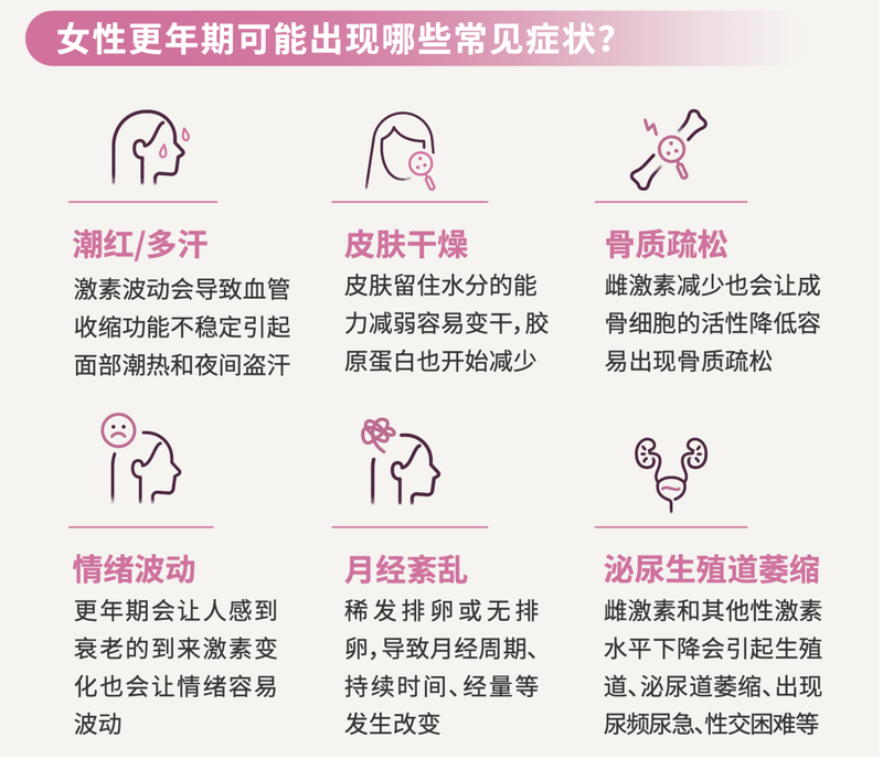 约八成女性,会经历至少一种更年期相关症状。有些是显而易见的:夜里突然一阵热浪涌上来、面部潮红、盗汗湿衣,月经开始变得不规律。有些则更隐蔽,也更容易被忽视:情绪莫名波动、皮肤变干变薄、肌肉关节疼痛、胸闷心悸、反复尿频尿急……