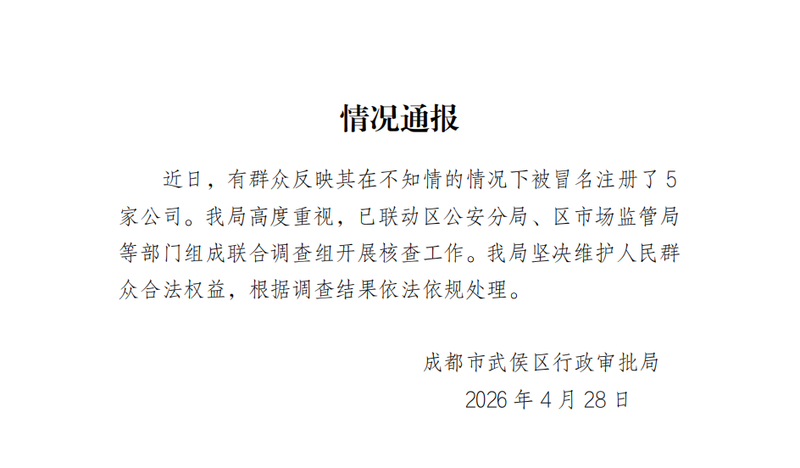 新京报讯 4月28日,成都市武侯区行政审批局发布情况通报,内容如下:编辑 毛天宇 点赞 +1 微博 微信 我要评论 登录 直播 直播中 直播|国务院政策例行吹风会 478人参与 预 告 走近一线法官丨法治追光 滋味盐都 2026-04-29 19:30 预 告 五一小长假迎尾声 直击北京、南京等地返程高峰 2026-05-05 17:00 预 告 五一小长假将至 直击北京等地出城路况及交通枢纽晚高峰 2026-04-30 17:00 热点 1 直击北京车展:长城汽车的“契约”实践与文化启示 23.8万 2 2026北京国际花展启幕 以花为笔绘就首都绿色发展新图景 23.2万 3 青创村实施“新村民”计划,推出“青创6条”支持年轻人创新创业 6.8万 4 甘肃榆中山洪灾害调查评估报告公布 6.1万 5 光的魔法攻击是啥样?3D打印的鞋成本150元能卖690元 6.0万 最新 首钢园:从百年钢厂到未来机器人高地 2分钟前 揭秘 | 南航“墩苗计划”已培养1375名飞行员副驾驶 3分钟前 45米外数声枪响,白宫晚宴惊魂|重建现场 26分钟前 国际丨美伊代表在安理会互批,伊朗批美国如同“海盗” 1小时前 一季度经济有“烟火气”:7省份消费热情高涨,更舍得为“享受”买单 1小时前 热议 提前订房、持枪冲场 美检方披露白宫记协晚宴枪手作案轨迹 新闻8点见丨《2025北京城市更新白皮书》出炉;中方禁止外资收购Manus项目 新疆维吾尔自治区商务厅党组书记、副厅长李轩被查 于川梓等30人被授予第三十六届北京青年五四奖章 14岁少年杀害同班女同学案一审宣判 蒋某某被判处无期徒刑