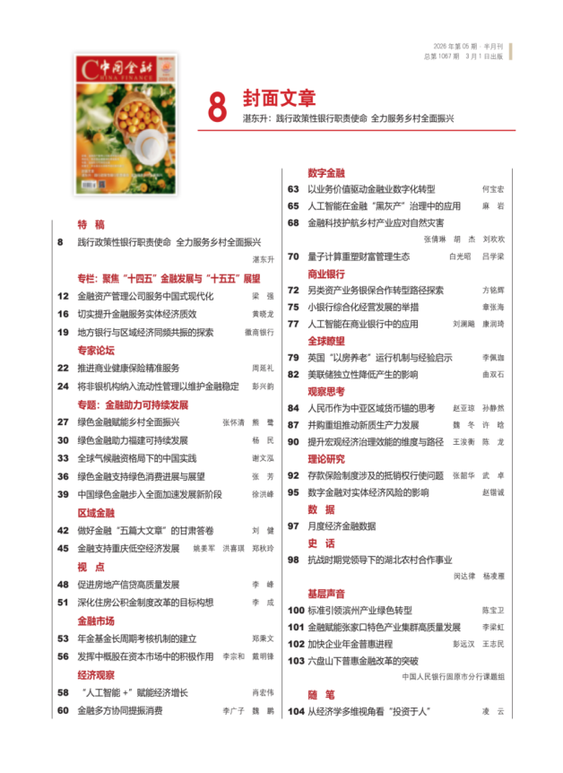 湛东升在《中国金融》2026年第5期撰文《践行政策性银行职责使命 全力服务乡村全面振兴》指出,2025年12月召开的中央农村工作会议,在“十四五”圆满收官、“十五五”开局起步的关键节点,为新时期“三农”工作作出重大战略部署,释放出重农强农惠农的强烈信号。当前,我国农业基础不牢固、城乡发展不平衡、农村发展不充分依然是社会主要矛盾的重要体现,农业农村仍然是社会主义现代化建设的突出短板。必须坚决贯彻农业农村优先发展方针,要素配置上优先考虑,公共服务上优先保障,金融资源上优先满足,推动土地、资金、人才等资源倾斜聚焦,确保农业农村农民与国家同步基本实现现代化。中国农业发展银行作为我国唯一的农业政策性银行,是中国特色现代金融体系的重要组成部分,是国家支持“三农”发展的重要力量,在服务国家重大战略和薄弱环节等方面发挥着不可替代的作用。中国农业发展银行将认真学习贯彻中央农村工作会议精神,恪守金融工作的政治性、人民性,锚定农业农村现代化目标,扎实做好金融“五篇大文章”,充分发挥农业政策性金融职能作用,全力服务乡村全面振兴和农业强国建设。一是深刻学习领会会议精神,切实增强服务乡村全面振兴的责任感使命感;二是聚焦主责主业,持续加大“三农”重点领域和薄弱环节的金融支持力度;三是坚持守正创新,着力推进治理体系和治理能力现代化,为服务乡村全面振兴提供坚实保障。