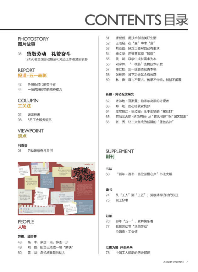 《中国工人》编辑部在《中国工人》2025年第5期撰文《奋斗,奋斗,奋斗到底:探访“中国工人运动历史和发展成就展”》指出,2025年是中华全国总工会成立100周年。在4月28日举行的庆祝中华全国总工会成立100周年暨全国劳动模范和先进工作者表彰大会上,习近平总书记发表重要讲话,高度评价了百年来我国工人运动的光辉历程和伟大成就,指出中华全国总工会成立以来的100年,是马克思主义工运理论同中国工人运动具体实际相结合的100年,是我国工人阶级和工会组织矢志不渝跟党走、为实现中华民族伟大复兴团结奋斗的100年。