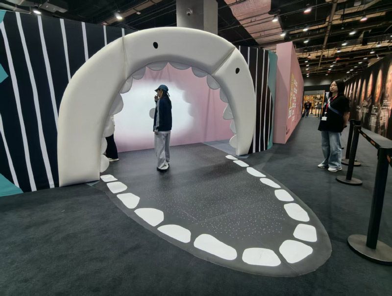 4月28日,中国科学技术馆,由法国国家科学技术总馆出品的科普互动体验展《肠子的小心思——肠道的奇妙冒险》开幕。图为嘉宾通过“巨型嘴巴”进入肠道之旅。