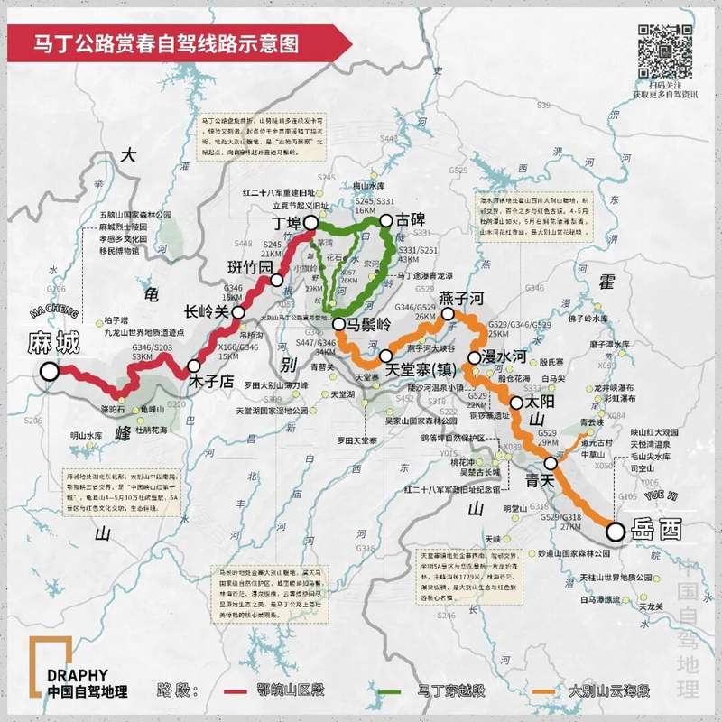 沿线还途经“将军之乡”麻城、立夏节起义主要爆发地的丁埠、鄂皖界山天堂寨、禅宗圣地司空山、“擎天一柱”天柱山……收藏这份自驾路书,随时可出发!