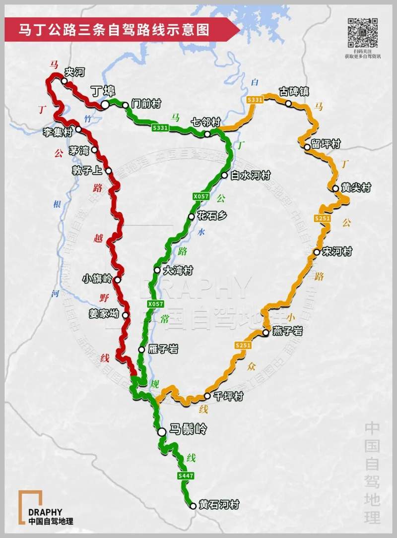 狭义的马丁公路,即从丁埠街道到马鬃岭景区,其实主要有三条路径,分别为:西线(红色)、中线(绿色)、东线(黄线)。