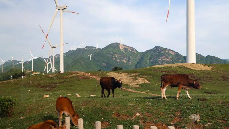 位于高山草甸之上的牛草山云雾缭绕,数十座白色风车在云海间悠然旋转。