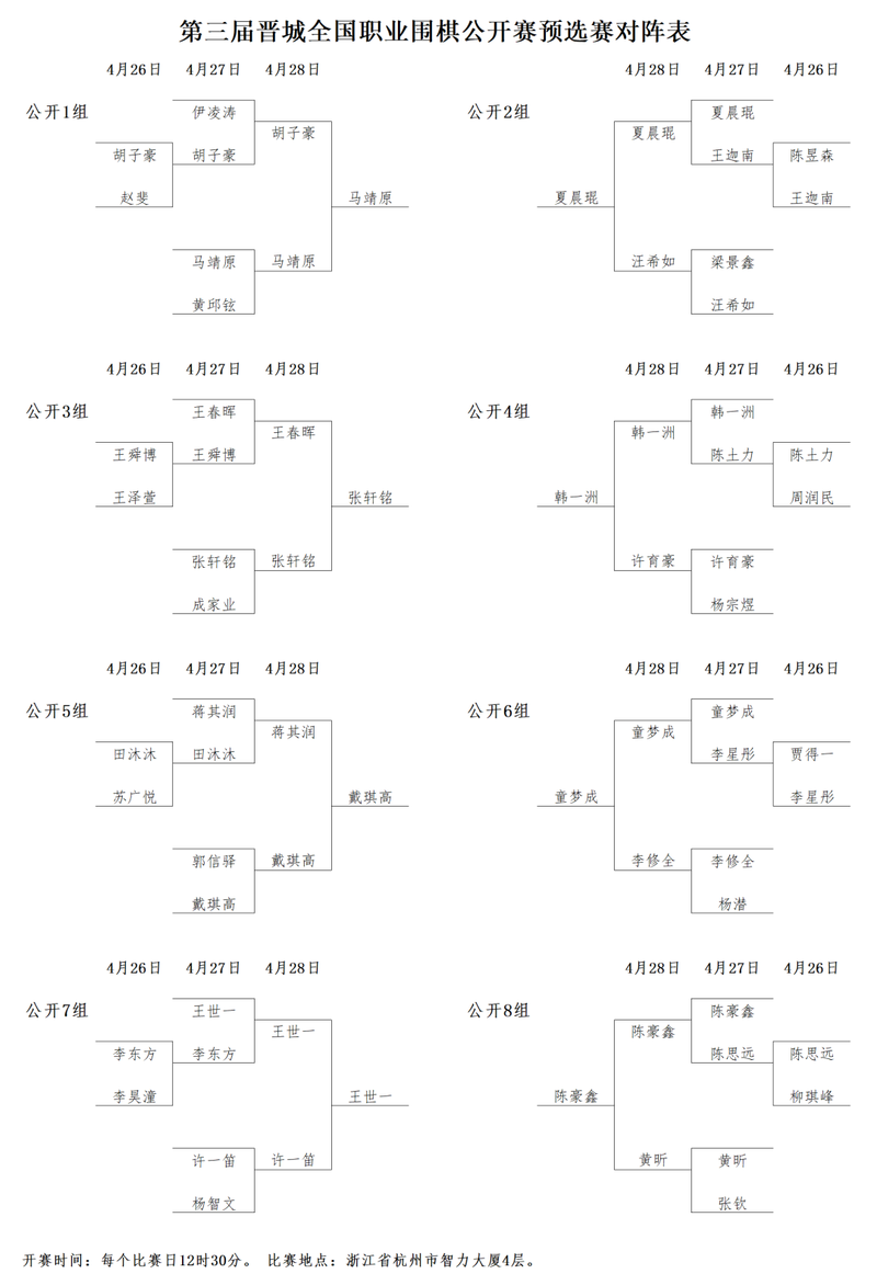 4月28日,第三届晋城全国职业围棋公开赛预选赛第三个比赛日在浙江省杭州市智力大厦结束。公开组王世一等24人、常青组芮乃伟、青少年15-16岁组尹成志、青少年U14组张一淼晋级本赛。女子组与青少年17-18岁组决胜轮将于4月29日继续进行。