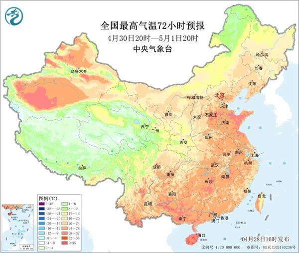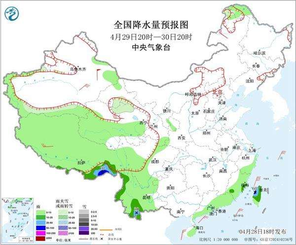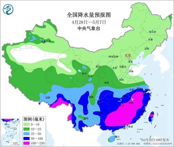具体来看,5月1日至3日,青藏高原、西北地区东部、黄淮南部及南方地区自西向东有大范围降雨天气过程,其中江南、华南中北部等地有大到暴雨,局地并伴有雷暴大风、短时强降水等强对流天气,南方强降雨主要在5月2日至3日。