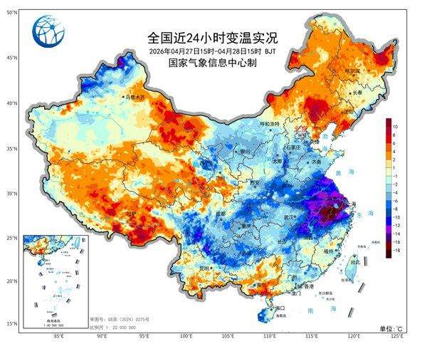 尤其对比昨天接近或达到30℃的暖热状态,反差非常大,像安徽、浙江局地24小时降温幅度甚至接近20℃。