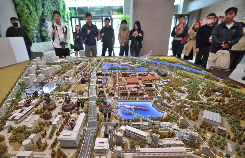 4月28日, “首钢园:从百年钢厂到未来机器人高地”集体采访活动举办,媒体记者一行参访了首钢园一高炉科幻乐园、未来数字街区、冬奥广场人形机器人产业基地。首钢园在首钢老厂区工业遗存基础上改造更新而成,将老厂房、高炉、冷却塔等工业构筑物改造为科幻体验空间、会展中心、体育场馆、商业配套等多元功能载体,实现从“工业锈带”向“活力秀场”的跨越式转型。截至2025 年末,在园企业数量达1030家,国高新、专精特新、瞪羚企业等企业资质超190项,企业营收规模达779亿元,加速迈向千亿级科技创新产业集群。图为首钢园北区沙盘。