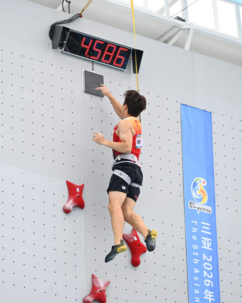 在亚沙会男子速度攀岩预赛中,中国选手赵一程以4秒58的成绩创造该项目世界纪录。原纪录是由美国选手沃森在2025年攀岩世界杯巴厘岛站中创造的4秒64。(新华社)