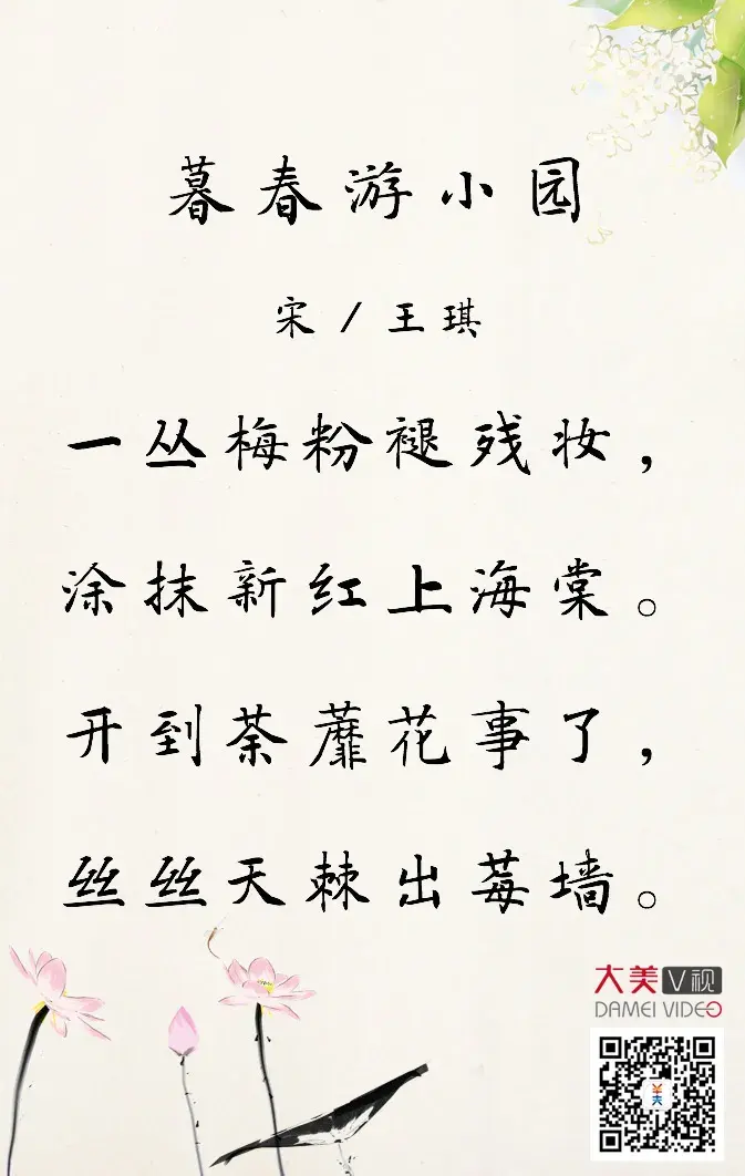 题目为《暮春游小园》,但景色却不是完全写实。更多的则是出于回忆和想象。虽然题目叫“暮春”,诗人却把春天从开始到结束的一整个过程,全都回想了一遍。