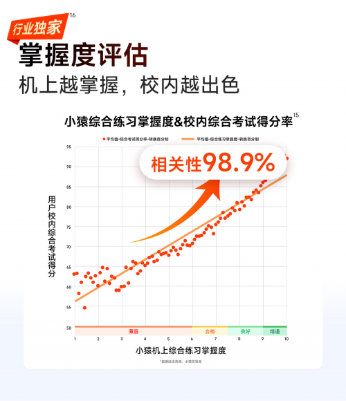 这可不是简单的单次练习正确率。据小猿官方资料,掌握度模型是基于题目难度、区分度、解题速度以及真题表现等多维度因素,对孩子知识点掌握程度进行的全局动态评估。实际体验中,孩子每完成一次练习,相应知识点的掌握度数值就会实时更新,并被划分为薄弱、合格、良好、精通四个等级,让进步大小一目了然。更值得关注的是,小猿研发团队用25万份真实考试试卷与机上练习数据做了关联分析,发现学生综合练习掌握度与考试得分率的相关性高达98.9%。这意味着,机上掌握度越高的孩子,在真实考场上拿高分的概率就越大,这样的数据验证让这套系统拥有了相当的说服力。